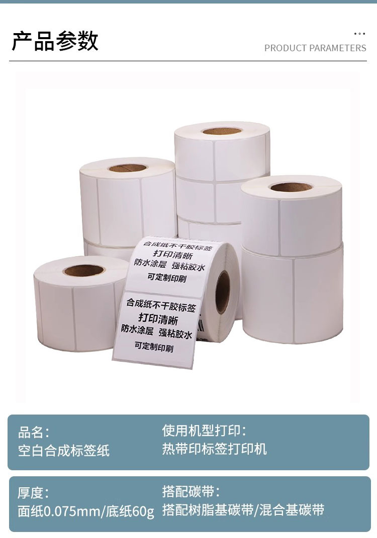 产品详情product details合成纸是市场上广泛应用的一种不干胶材料,合成纸包含PP合成纸,热敏合成纸,PET合成纸,PVC合成纸,亚银合成纸等, 其特点是防水、防油、撕不破,撕不破,印刷效果美观等特点,广泛应用于药品、食品,仓储、工业、饮品、电器、文化用品的信息及合格证标签。