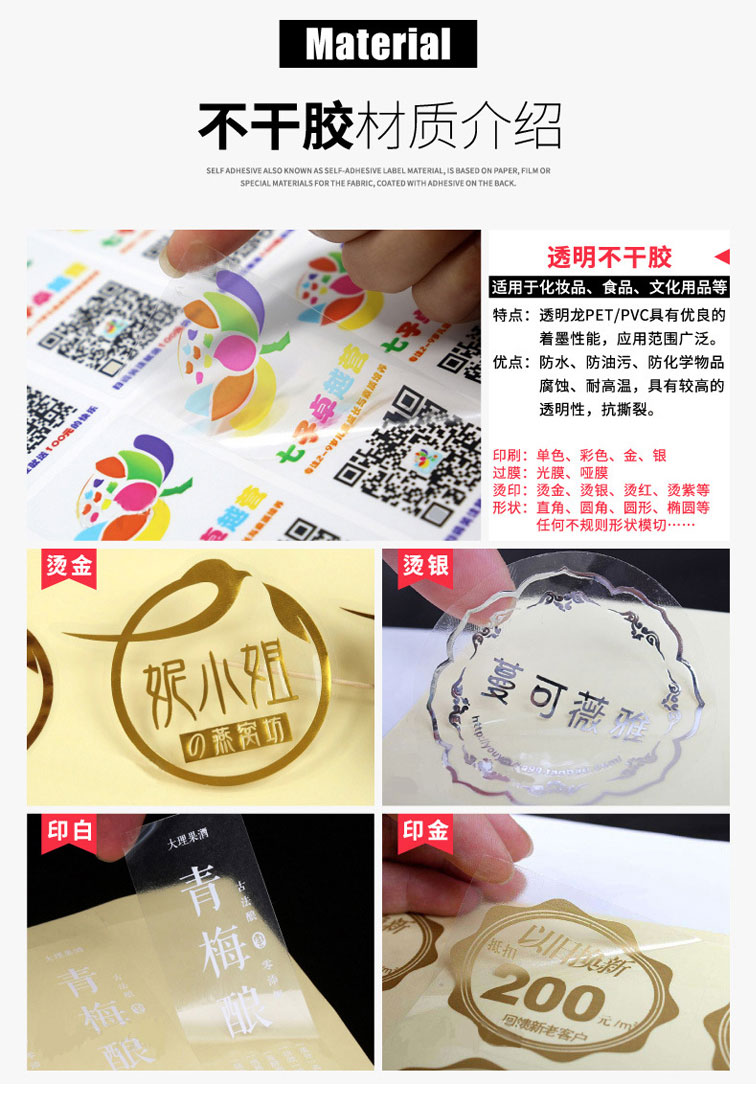 透明不干胶标签是一种以透明膜为基材的标签,具有高透明度、防水防油、耐高温等特点,广泛应用于食品饮料、日化用品、电子产品等领域。